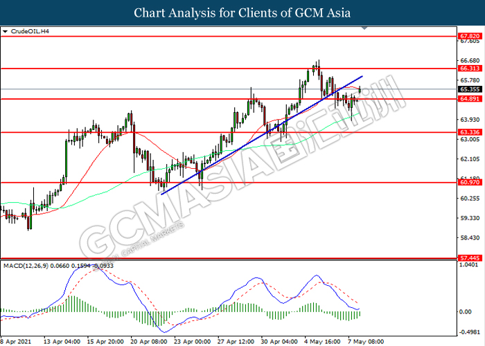CrudeOIL, H4: Crude oil price was traded higher following prior rebound from the support level at 64.90. MACD which illustrated diminishing bearish momentum suggest the commodity to extend its gains toward resistance level at 66.30.