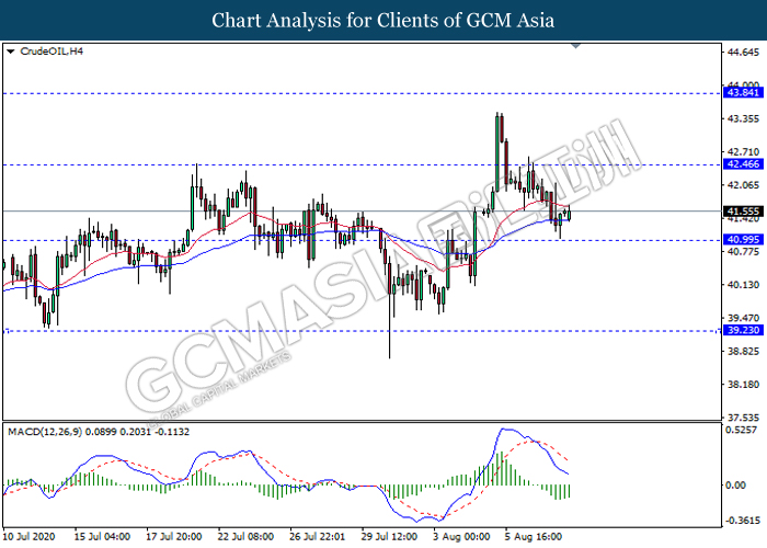 CrudeOIL, H4: Crude oil price was traded higher following prior rebound from the support level 41.00. MACD which illustrate diminishing bearish momentum signal suggest the pair to extend its rebound to resistance level 42.45.