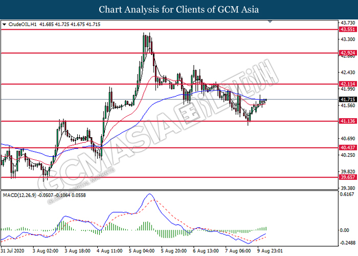 CrudeOIL, H1: Crude oil price was traded higher following prior rebound from the support level at 41.15. MACD which illustrate bullish bias momentum signal suggest the commodity to extend its gains toward the resistance level at 42.10.