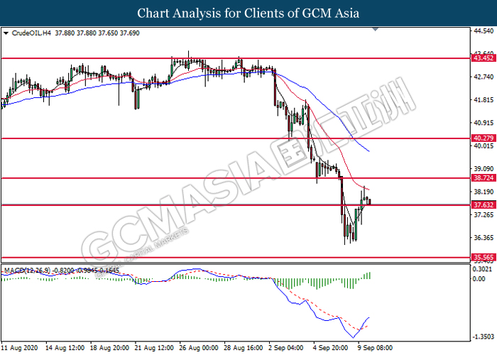 CrudeOIL, H4: Crude oil price was traded lower while currently testing the support level at 37.65. However, MACD which illustrate bullish bias momentum suggest the commodity to undergo technical rebound in short term.