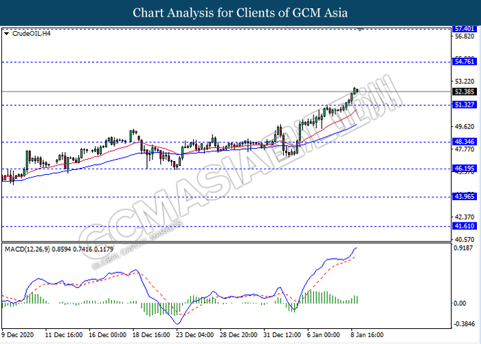CrudeOIL, H4: Crude oil price was traded higher following prior breakout above the previous resistance level 51.30. However, MACD which illustrate diminishing bullish momentum signal suggest the commodity to be traded lower as a short-term technical correction towards the current support level 51.30.