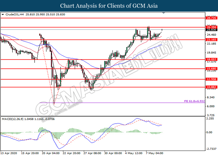 CrudeOIL, H4: Crude oil price was traded higher while currently testing near the resistance level at 26.40. MACD which illustrate diminishing bearish momentum suggest the commodity to extend its gains after it successfully breakout above the resistance level at 26.40.