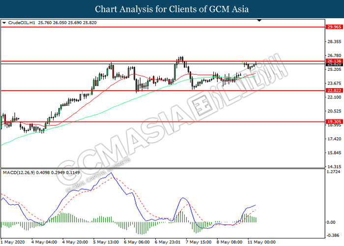 CrudeOIL, H1: Crude oil price was traded higher while currently testing the resistance level at 26.15. However, MACD which illustrated diminishing bullish momentum suggest the commodity to be traded lower in short-term as technical correction.