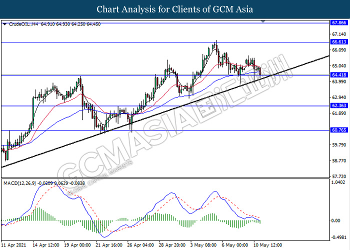 CrudeOIL, H4: Crude oil price was traded lower while currently testing the support level 64.40. MACD which illustrate bearish momentum signal suggest the commodity to extend its losses after it breaks below the support level.