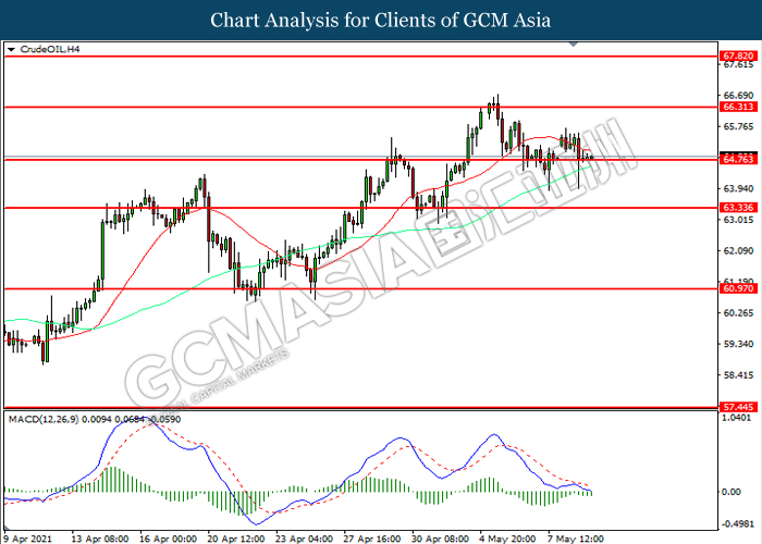 CrudeOIL, H4: Crude oil price was traded lower while currently testing the support level at 64.75. MACD which illustrated increasing bearish momentum suggest the commodity to extend its losses after it successfully breakout below the support level.