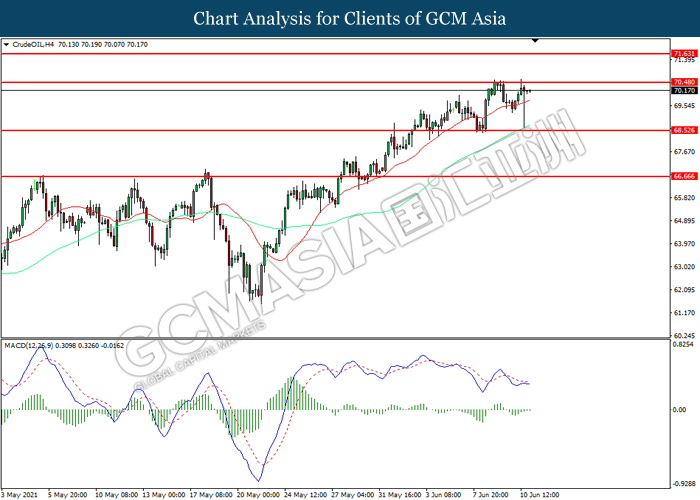 CrudeOIL, H4: Crude oil price was traded higher while currently testing the resistance level at 70.45. MACD which illustrated diminishing bearish momentum suggest the commodity to extend its gains after it successfully breakout above the resistance level.