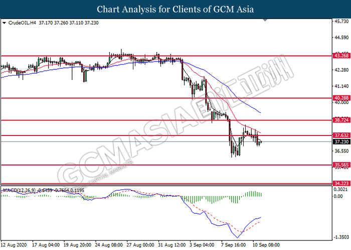 CrudeOIL, H4: Crude oil price was traded lower following prior retracement from the resistance level at 37.65. MACD which illustrate diminishing bullish momentum suggest the commodity to extend its losses toward the support level at 35.55.