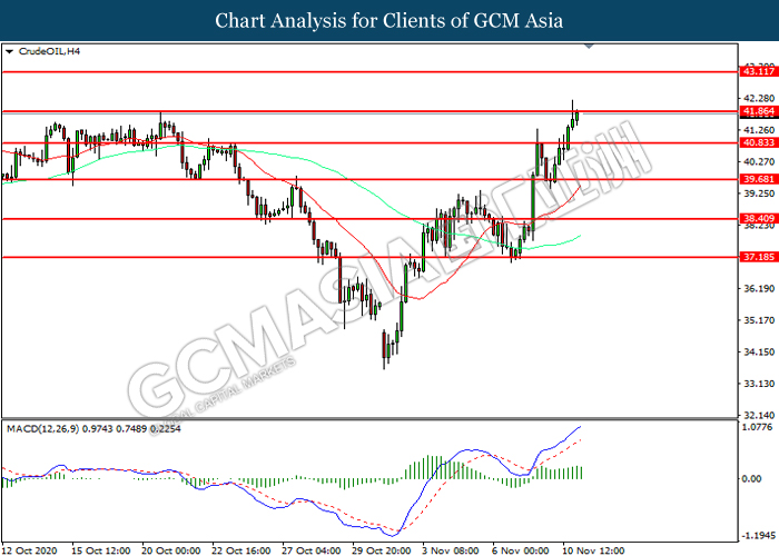 CrudeOIL, H4: Crude oil price was traded higher while currently testing the resistance level at 41.85. However, MACD which illustrated diminishing bullish momentum suggest the commodity to be traded lower in short-term as technical correction.