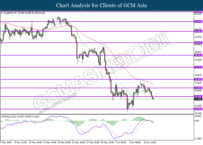 CrudeOIL, H4: Crude oil price was traded lower after breaking below previous support level at 50.90. MACD which display bearish momentum with the formation of death cross suggest the commodity to extend its losses towards the support level 50.90.