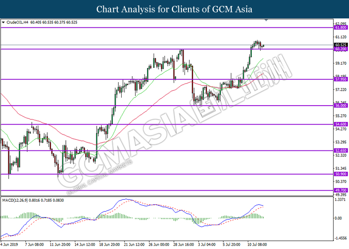 CrudeOIL, H4: Crude oil price was traded lower while currently testing the support level 60.20. MACD which illustrate diminishing bullish momentum suggest the commodity to extend its losses after successfully breaking below the support level.
