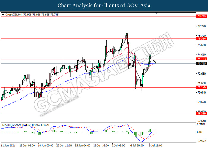 CrudeOIL, H4: Crude oil price was traded lower following prior retracement from the resistance level 74.20. MACD which illustrate diminishing bullish momentum signal suggest the pair to extend its retracement towards the support level 71.15.