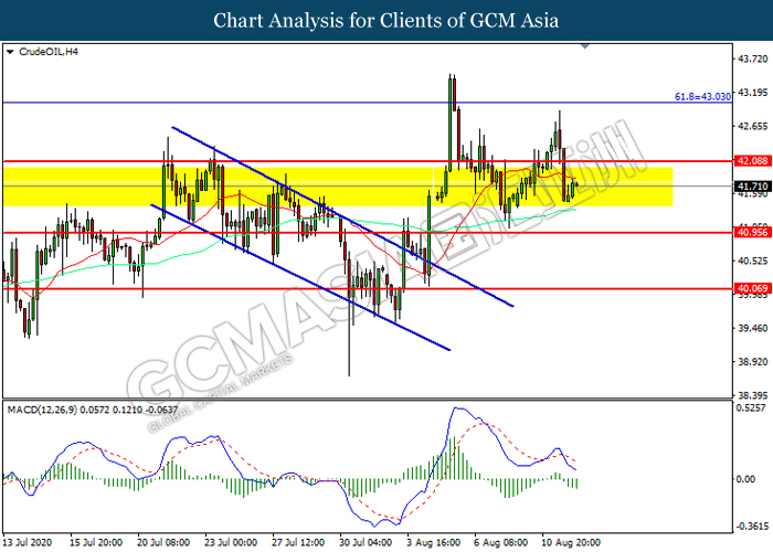 CrudeOIL, H4: Crude oil price was traded lower following prior breakout below the previous support level at 42.10. MACD which illustrated increasing bearish momentum suggest the commodity to extend its losses toward support level at 40.95.