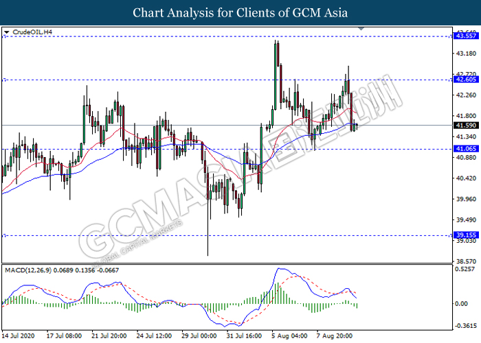 CrudeOIL, H4: Crude oil price was traded lower following prior retracement from the resistance level 42.85. MACD which illustrate bearish momentum suggest the commodity to extend its losses towards the support level 41.05.