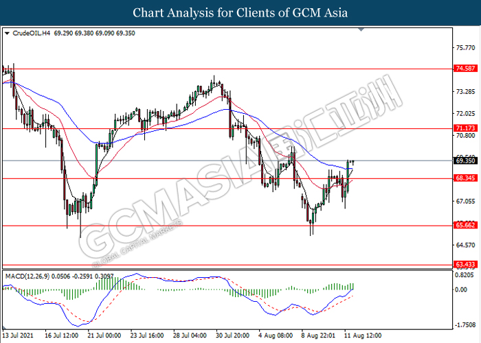CrudeOIL, H4: Crude oil price was traded higher following prior breakout above the previous resistance level 68.35. MACD which illustrate bullish bias signal suggest the commodity to extend its gains towards the resistance level 71.15.