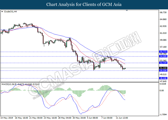 CrudeOIL, H4: Crude oil price was traded lower while currently testing the support level 50.55. However, MACD which illustrate diminishing bearish momentum suggest the commodity to be traded higher in short term as technical correction towards the resistance level 52.70.