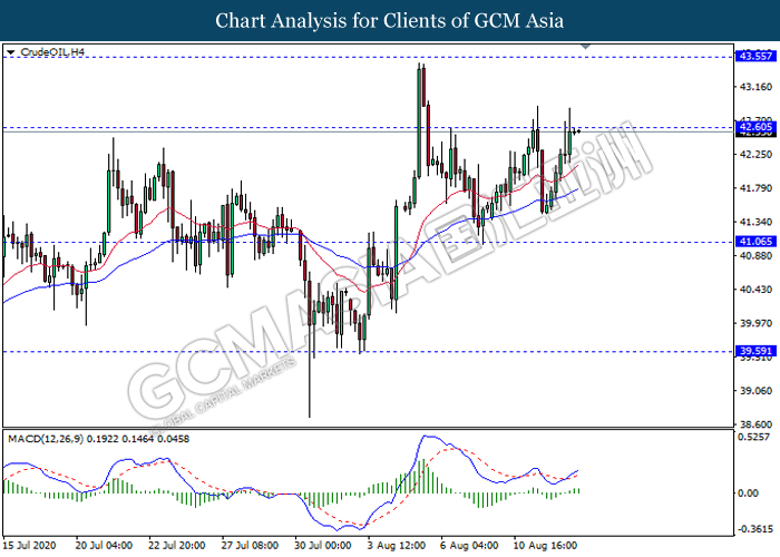 CrudeOIL, H4: Crude oil price was traded higher while currently testing the resistance level 42.60. MACD which illustrate bullish momentum signal suggest the commodity to extend its gains after it breaks above the resistance level 42.60.