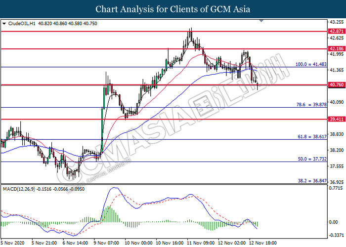 CrudeOIL, H1: Crude oil price was traded lower while currently testing the support level at 40.75. MACD which illustrate bearish bias momentum signal suggest the commodity to extend its losses after it successfully breakout below the support level at 40.75.