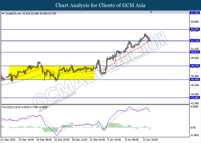 CrudeOIL, H4: Crude oil price was traded lower while currently testing the support level 52.70. MACD which illustrate bearish momentum signal with the formation of death cross suggest the commodity to extend its losses after it breaks below the support level.