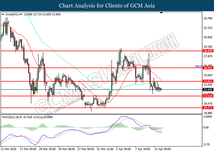 CrudeOIL, H4: Crude oil price was traded lower following prior breakout below the previous support level at 23.90. However, MACD which illustrated diminishing bearish momentum suggest the commodity to be traded higher in short-term as technical correction.