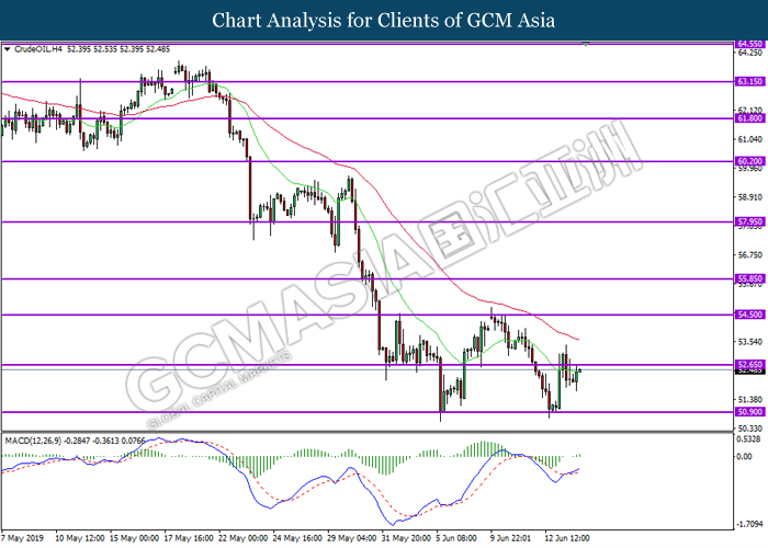 CrudeOIL, H4: Crude oil price was traded higher while currently testing near the resistance level 52.65. MACD which display bullish momentum with the formation of golden cross suggest the commodity to extend its gains after successfully breaking above the resistance level.