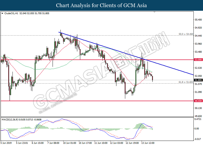 CrudeOIL, H1: Crude oil price remains traded within a descending triangle formation. MACD which has formed a death cross signal suggests its price to be traded lower after closing below 51.60.