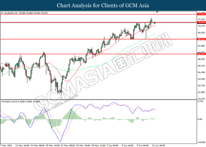 CrudeOIL, H4: Crude oil price was traded higher while currently testing the resistance level at 70.60. However, MACD which illustrated diminishing bullish momentum suggest the commodity to be traded lower in short-term as technical correction.