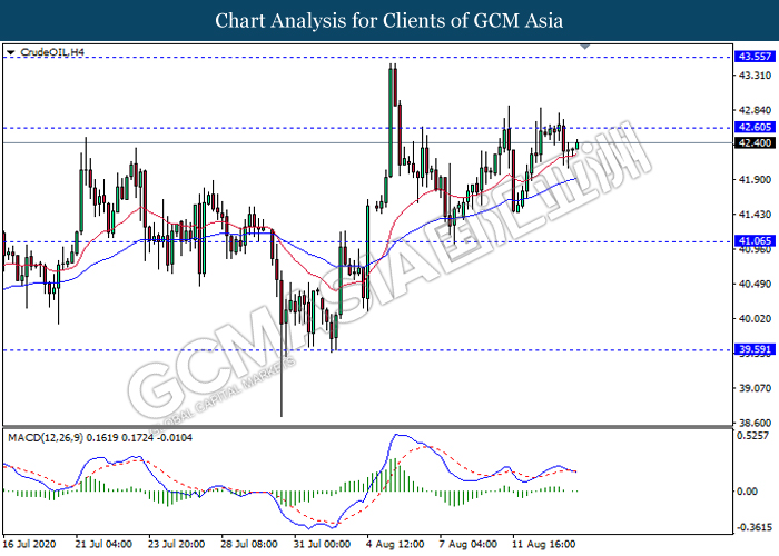 CrudeOIL, H4: Crude oil price was traded higher while currently testing the resistance level 42.60. However, MACD which illustrate diminishing bullish momentum signal suggest the commodity to experience a technical correction towards the support level 41.05.