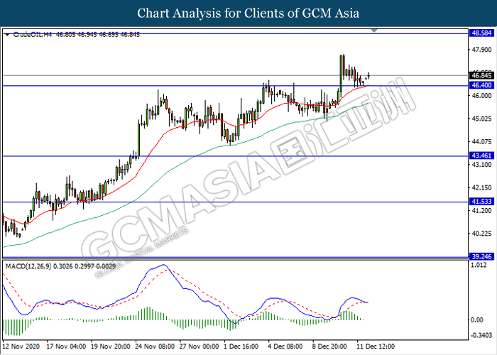 CrudeOIL, H4: Crude oil price was traded lower while currently testing near the support level 46.40. MACD which illustrate diminishing bullish momentum signal with the starting formation of death cross suggest the commodity to extend its losses after it breaks below the support level.