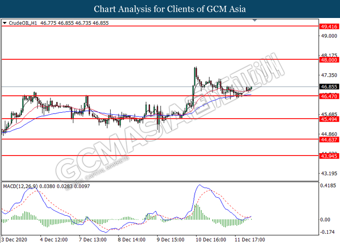CrudeOIL, H1: Crude oil price was traded higher following prior rebound from the support level at 46.45. MACD which illustrate diminishing bearish momentum signal suggest the commodity to extend its gains toward the resistance level at 48.00.