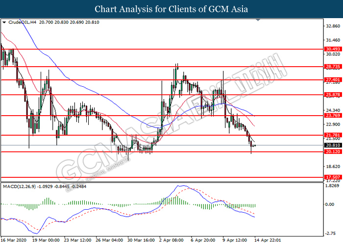 CrudeOIL, H4: Crude oil price was traded lower following prior breakout below the previous support level at 21.80. However, MACD which illustrate diminishing bearish momentum suggest the commodity to undergo technical correction toward the resistance level at 21.80.