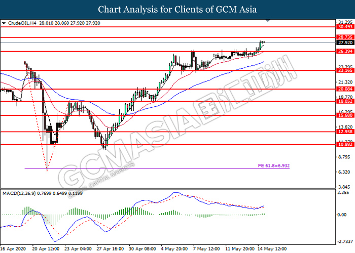 CrudeOIL, H4: Crude oil price was traded higher following prior breakout above the previous resistance level at 26.40. MACD which illustrate bullish bias momentum suggest the commodity to extend its gains toward the resistance level at 28.75.