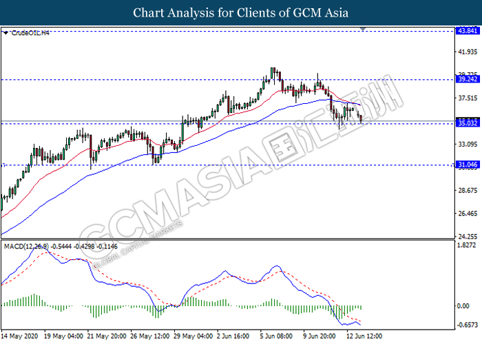 CrudeOIL, H4: Crude oil price was traded lower while currently testing the support level 35.05. MACD which illustrate ongoing bearish momentum signal suggest the commodity to extend its losses after it breaks below the support level 35.05.