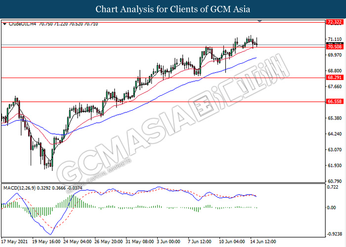 CrudeOIL, H4: Crude oil price was traded lower while currently testing the support level 70.50. MACD which illustrate bearish momentum signal suggest the commodity to extend its losses after it breaks below the support level 70.50.