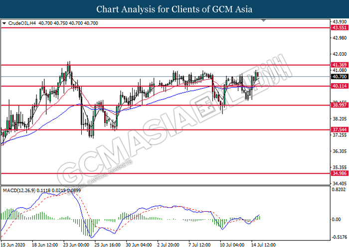 CrudeOIL, H4: Crude oil price was traded higher following prior breakout above the previous resistance level at 40.10. MACD which illustrate bullish bias momentum signal suggest the commodity to extend its gains toward the resistance level at 41.35.