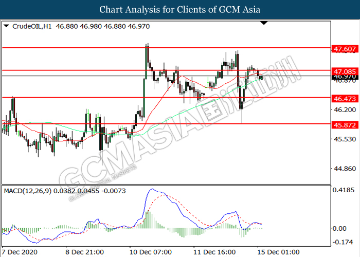 CrudeOIL, H1: Crude oil price was traded lower following prior retracement from the resistance level at 47.10. MACD which illustrated increasing bearish momentum suggest the commodity to extend its losses toward support level at 46.45.