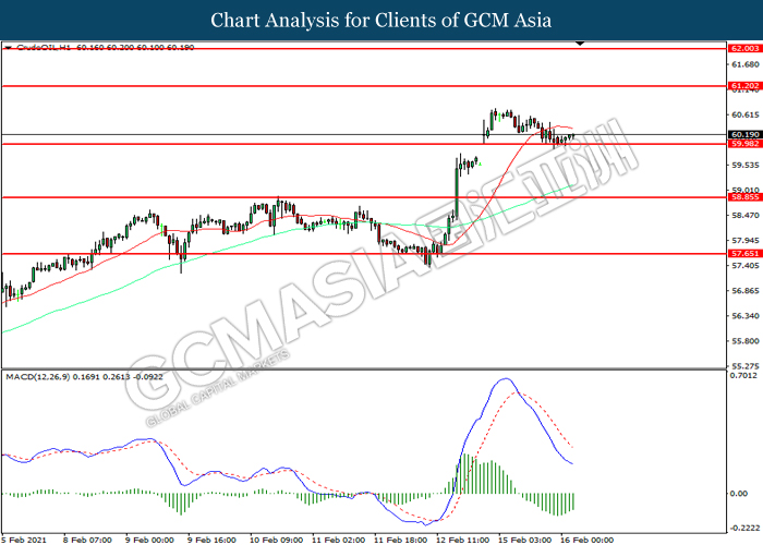 CrudeOIL, H1: Crude oil price was traded lower while currently testing the support level at 60.00. However, MACD which illustrated diminishing bearish momentum suggest the commodity to be traded higher in short-term as technical correction.