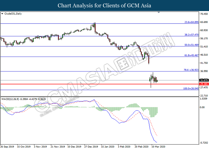 CrudeOIL, Daily: Crude oil price was traded lower while currently testing the support level at 29.40. However, MACD which illustrated diminishing bearish momentum suggest the commodity to be traded higher in short-term as technical correction.