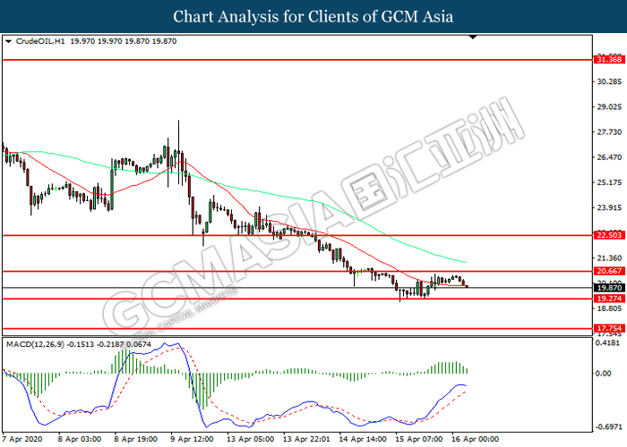 CrudeOIL, H1: Crude oil price was traded lower following prior retracement from the resistance level at 20.65. MACD which illustrated diminishing bullish momentum suggest the commodity toward support level at 19.25.