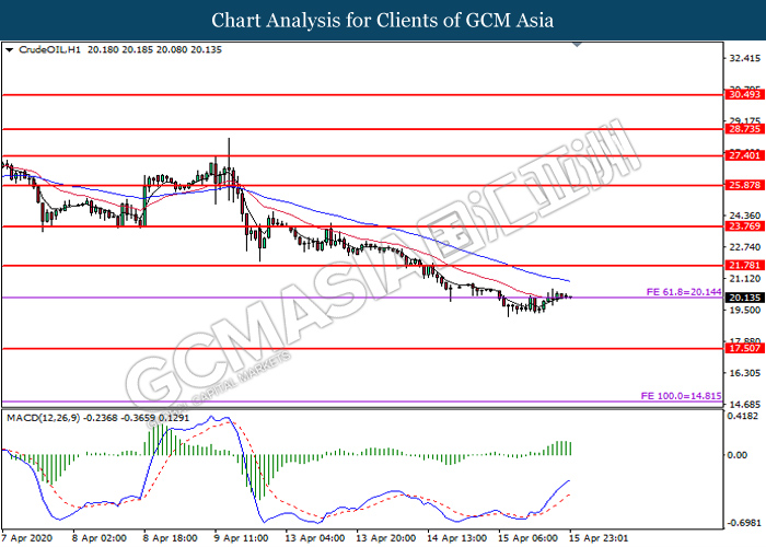 CrudeOIL, H1: Crude oil price was traded flat near the support level at 20.15. MACD which illustrate diminishing bullish momentum suggest the commodity to be traded lower in short term after it successfully breakout below the support level at 20.15.