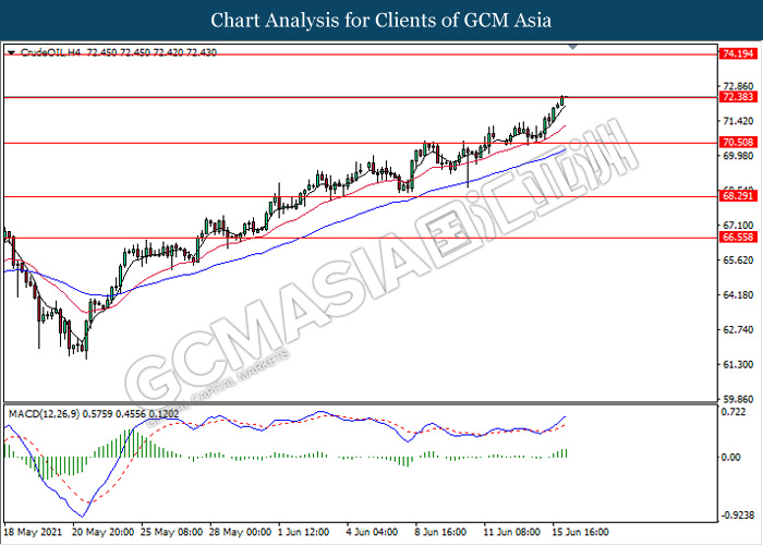 CrudeOIL, H4: Crude oil price was traded higher while currently testing the resistance level 72.40. MACD which illustrate bullish momentum signal suggest the commodity to extend its gains after it breaks above the resistance level.