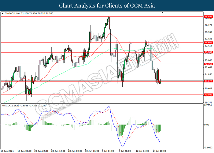 CrudeOIL, H4: Crude oil price was traded lower while currently testing the support level at 71.25. However, MACD which illustrated diminishing bearish momentum suggest the commodity to be traded higher in short-term as technical correction.
