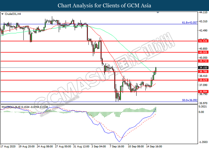 CrudeOIL, H4: Crude oil price was traded higher following prior breakout above the resistance level at 39.75. MACD which illustrated increasing bullish momentum suggest the commodity to extend its gains toward resistance level at 39.75.