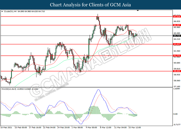 CrudeOIL, H4: Crude oil price was traded lower following prior retracement from the resistance level at 66.25. However, MACD which illustrated diminishing bearish momentum suggest the commodity to be traded higher in short-term as technical correction.