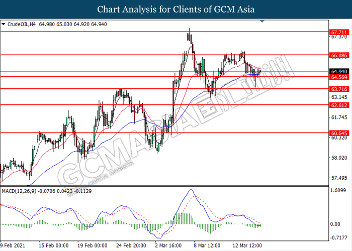 CrudeOIL, H4: Crude oil price was traded higher following prior rebound from the support level at 64.55. MACD which illustrated diminishing bearish momentum suggest the commodity to extend its gains toward the resistance level at 66.10.