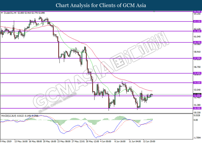 CrudeOIL, H4: Crude oil price was traded higher following prior closure above previous resistance level at 52.65. MACD which illustrate bullish bias signal suggest the commodity to extend its gains after successfully closing above the 60-MA line (red).