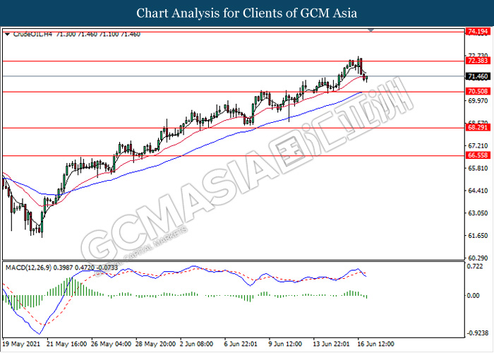 CrudeOIL, H4: Crude oil price was traded lower following prior retracement from the resistance level 72.40. MACD which illustrate bearish momentum signal with the formation of death cross suggest the commodity to extend its retracement towards the support level 70.50.