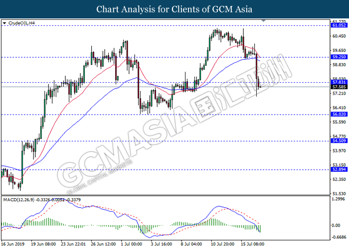 CrudeOIL, H4: Crude oil price was traded lower following prior breakout below previous support level 57.85. MACD which display persistent bearish momentum suggest the commodity to extend its losses towards the support level 56.00.