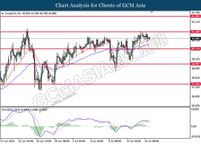 CrudeOIL, H4: Crude oil price was traded lower following prior retracement from the resistance level at 41.35. MACD which illustrate diminishing bullish momentum signal suggest the commodity to extend its losses toward the support level at 40.10.