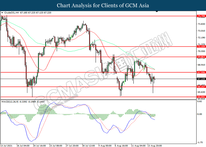 CrudeOIL, H4: Crude oil price was traded lower following prior breakout below the previous support level at 68.00. However, MACD which illustrated diminishing bearish momentum suggest the commodity to be traded higher in short-term as technical correction.