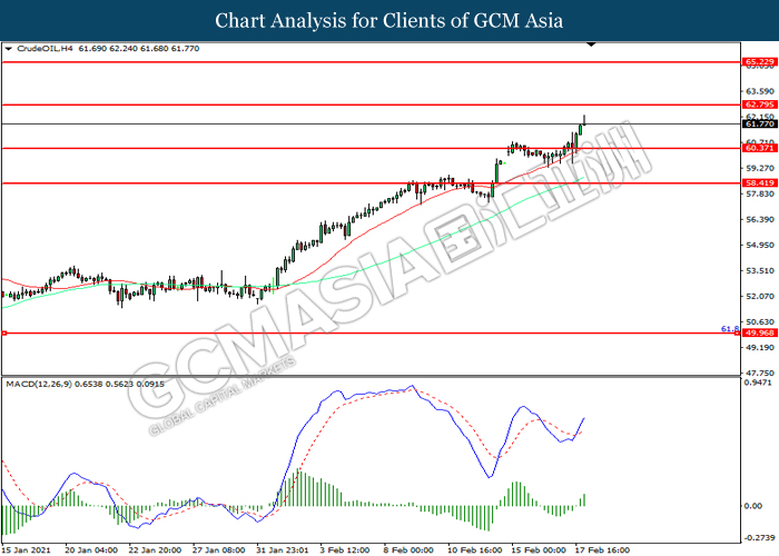 CrudeOIL, H4: Crude oil price was traded higher following prior breakout above the previous resistance level at 60.40. MACD which illustrated increasing bullish momentum suggest the commodity to extend its gains toward resistance level at 62.80.